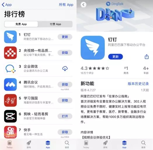 數(shù)據(jù)顯示,2月3日,有2億人開(kāi)啟「云開(kāi)工」模式。在線辦公早已不是什么新鮮事,尤其是于互聯(lián)網(wǎng)企業(yè)而言更是推行了多年。但我們認(rèn)為,此次疫情給傳統(tǒng)辦公方式帶來(lái)的影響將是變革性的。2月5日,在蘋(píng)果應(yīng)用商店的排行榜中,阿里巴巴旗下的在線辦公平臺(tái)——釘釘,超越了此前排名第一的微信,躍居榜單第一。這也是蘋(píng)果應(yīng)用商店排行榜歷史上,首次有辦公類(lèi)應(yīng)用位居第一。