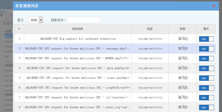 網頁過濾中的網址庫可以過濾掉大部分惡意網站,但是不可避免會有未收錄到網址庫中的惡意網站。這時候我們就需要仰仗”***防御“這個模塊的功能,***防御可以檢測各種***惡意軟件的***特征。在檢測到***時,直接封鎖該IP,就可以防止后續(xù)的動作。