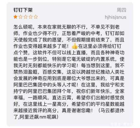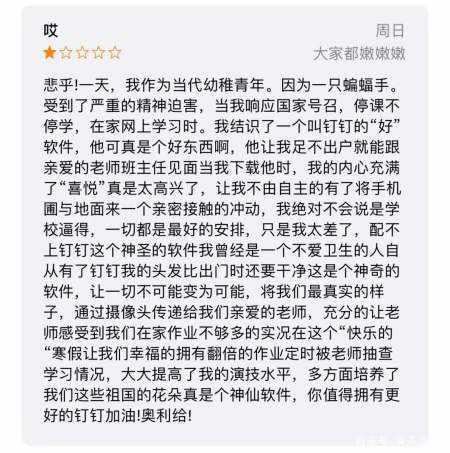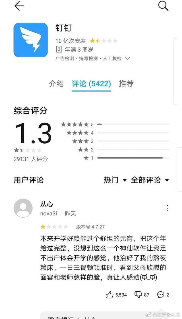由于學校停課,但是停課不停學,所以很多學校采用網(wǎng)上授課的方式來進行授課,所以老師和學生就用釘釘來進行網(wǎng)上授課然后釘釘是真的太慘了,學生直播看網(wǎng)課,報復性亂評分。低至1.3的評分,這是快要下架的節(jié)奏啊。