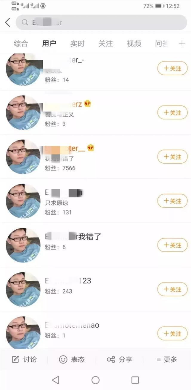 然而今天我們要說的,是另一件稀奇事——何昊微博刪除后,網(wǎng)上忽然又出現(xiàn)多個名為“E****ter”及“何**”的微博用戶,且頭像與何昊微博頭像一模一樣,個人簡介為“求原諒”、“求放過”、“對不起大家”等內(nèi)容。
