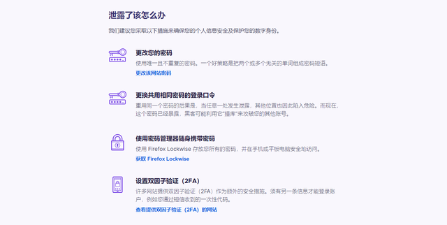 如果發(fā)現(xiàn)數(shù)據(jù)被泄露了該怎么辦,Firefox Monitor很貼心地在這里給出了一些建議。