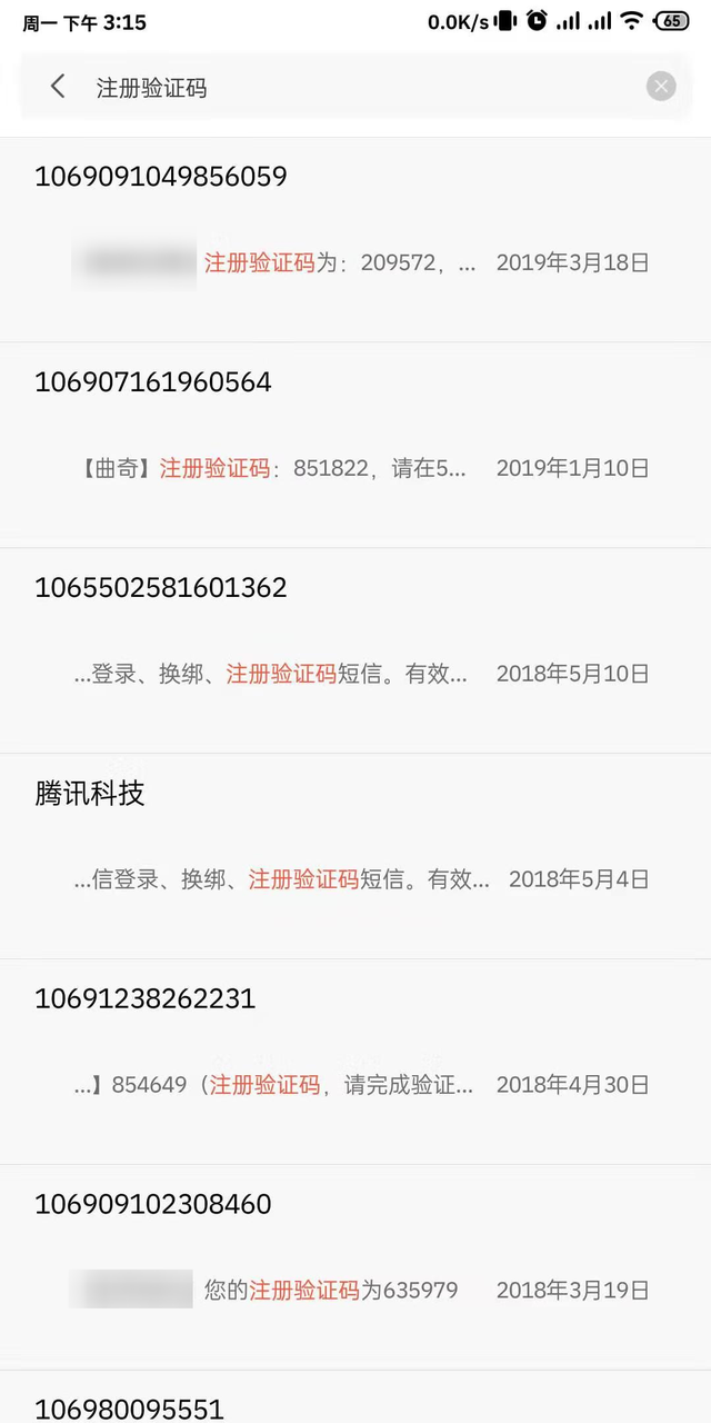 所以呢我們只需要短信里面搜索關(guān)鍵詞“驗(yàn)證碼”或者“注冊(cè)驗(yàn)證碼”,一般都能找到我們注冊(cè)過(guò)的一些網(wǎng)站。