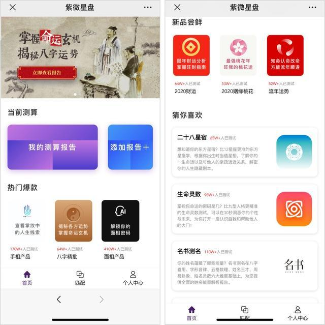 有新品嘗鮮——64 萬(wàn)多人測(cè)試的“2020財(cái)運(yùn)”,53萬(wàn)多人測(cè)試的“2020姻緣桃花”,52 萬(wàn)多人測(cè)試的“流年運(yùn)勢(shì)”;