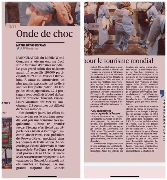 Sarah告訴澎湃新聞,得益于一位在法國生活志愿者的分享,他們讀到了當?shù)貓蠹埳弦黄P于受疫情影響下全球旅游業(yè)的動蕩局面的佳作,“我們很多人都是網(wǎng)站找新聞,似乎都不太關注印刷報紙了,其實那里頭也有很精彩的報道,而且有時它們不會變成電子版”。她們在譯文里附上了報紙的圖片。