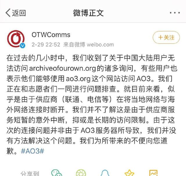 Ao3網(wǎng)站的官網(wǎng)也進(jìn)行了解釋,認(rèn)為不是他們服務(wù)器的問(wèn)題,而是可能當(dāng)?shù)鼐W(wǎng)絡(luò)和海外網(wǎng)絡(luò)連接時(shí)斷開,問(wèn)題不在他們,他們也努力,但貌似已經(jīng)解決不了問(wèn)題。