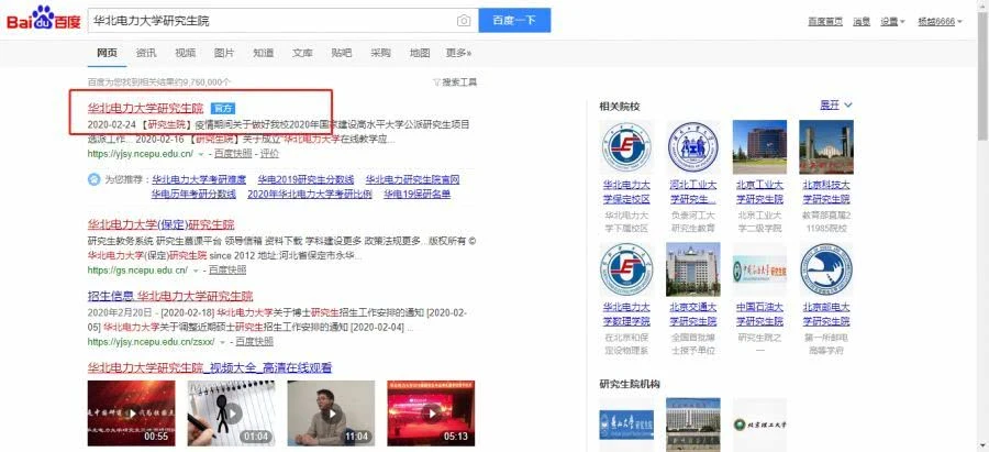 只要搜索“報考大學(xué)+研究生院”就能找到報考院校的招生信息。例如搜索“華北電力大學(xué)研究生院”,找到對應(yīng)官方網(wǎng)站即可,如下圖所示: