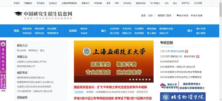 研招網(wǎng)還可以查看關(guān)于考研的常識、政策、資訊、流程等信息。但是研招網(wǎng)內(nèi)的信息并不全,可能有很多想要的信息在研招網(wǎng)找不到。這個時候可以去報考院校的官網(wǎng)去查找。