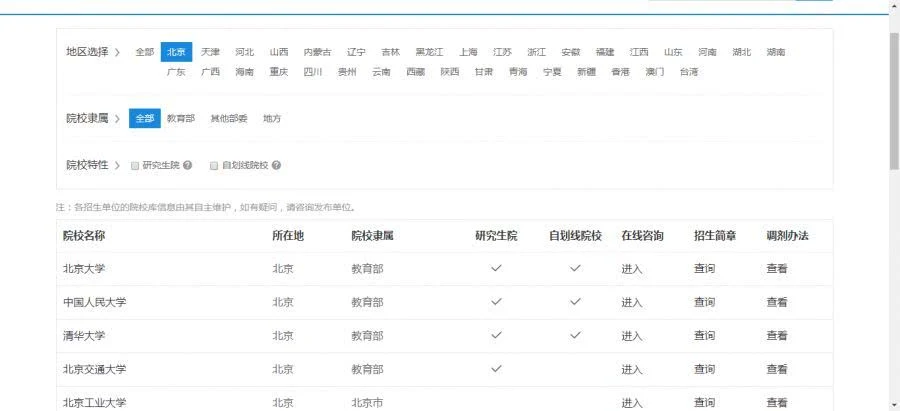 除了上述最基本的功用之外,研招網(wǎng)還能在“院校庫”中查看報考院校是否自主劃線、院校隸屬、招生簡章、調(diào)劑辦法等信息。如下圖所示: