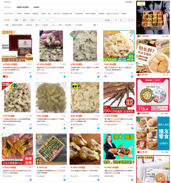 今天上午,第一財經(jīng)記者登陸某電商平臺發(fā)現(xiàn),仍存在大量商家售賣東北長白山蛤蟆林蛙油、雪蛤膏、林蛙干的信息,也有不少商家售賣獨角仙成蟲、蟈蟈、螳螂、蜈蚣、馬陸等野生動物活體。