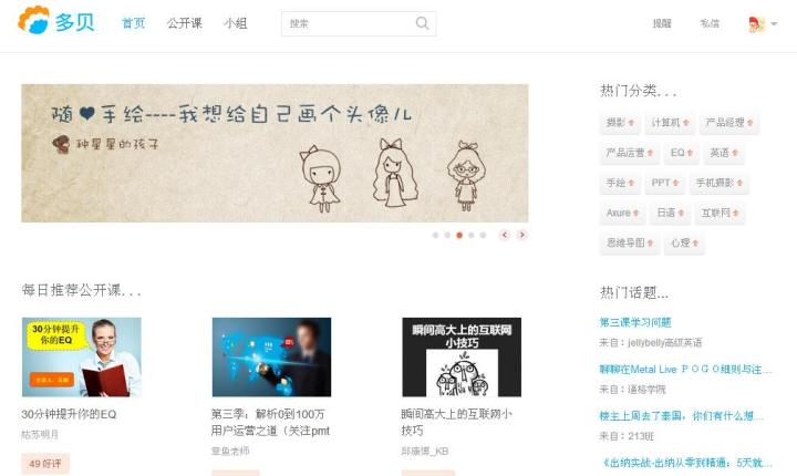 B2B2C平臺(tái)型----多貝公開課:B2B2C平臺(tái),主要通過個(gè)人老師入駐形式,向?qū)W習(xí)者提供在線和點(diǎn)播的網(wǎng)絡(luò)授課資源,內(nèi)容涉及各個(gè)領(lǐng)域。
