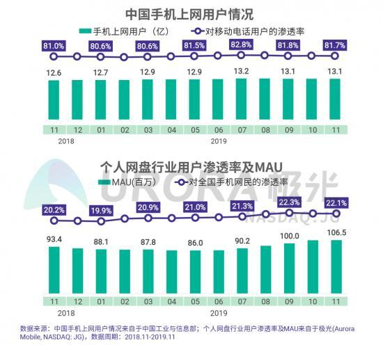 根據(jù)極光的《2019年個人網(wǎng)盤行業(yè)研究報告》顯示,個人網(wǎng)盤行業(yè)安裝滲透率由2018年11月的20.2%上升至2019年11月的22.1%,增長1.9個百分點;月度活躍用戶2019年下半年持續(xù)上升,11月達1.065億。