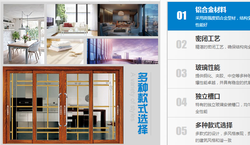(2)產(chǎn)品中心:用于介紹平開(kāi)門系列、推拉門/吊趟門系列、重型推拉門系列、重型折疊門系列、55平開(kāi)窗系列、隔熱斷橋窗系列、陽(yáng)光房系列等公司產(chǎn)品信息展示,圖文并茂;