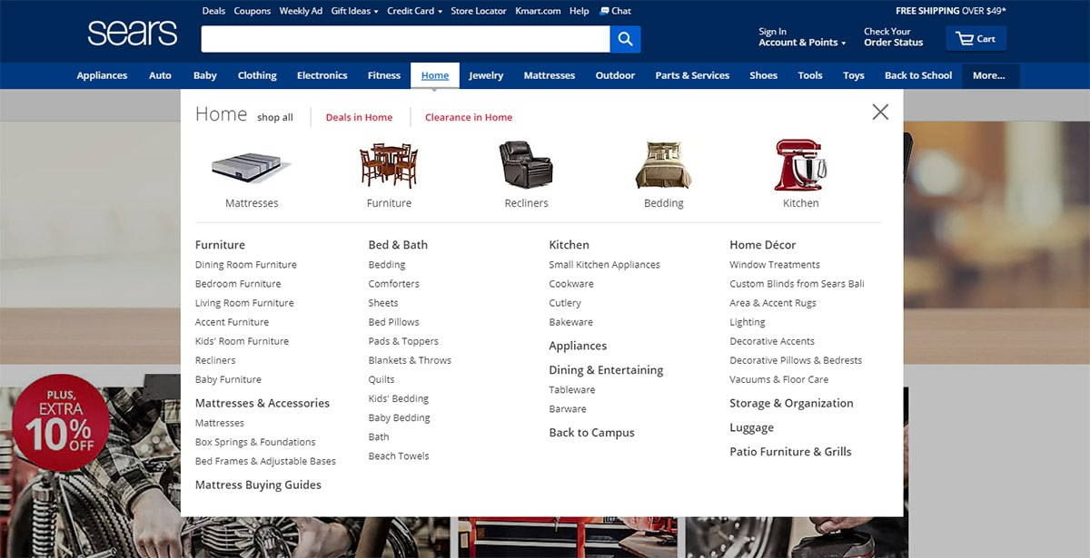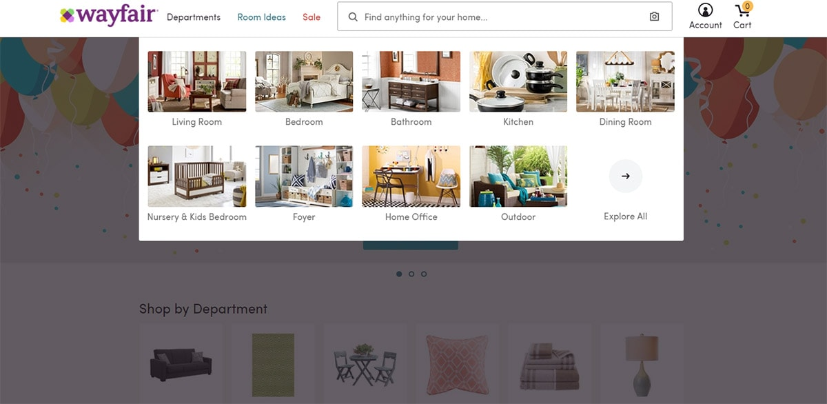 它使用一種非常獨特的下拉菜單。它們具有“部門”的鏈接,您可以在其中按類別甚至是臥室>床頭柜等子類別進(jìn)行瀏覽。 該鏈接旁邊是“會議室創(chuàng)意”的下拉列表,您可以在其中基于會議室進(jìn)行瀏覽。該下拉菜單在鏈接旁邊顯示圖像,因此您可以輕松瀏覽所有選項。 很快他們就意識到他們正在將導(dǎo)航項目分為幾類。這些遵循類似的趨勢,人工導(dǎo)航僅需 兩個主要鏈接 即可運(yùn)行!
