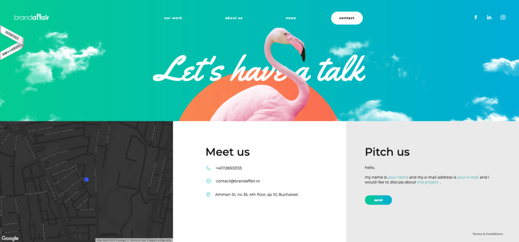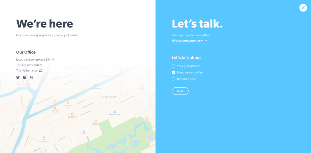 該網(wǎng)站對他們的聯(lián)系頁采取了創(chuàng)造性的方法。他們避免使用典型的“填寫我們聯(lián)系表”行話而是通過“讓們聊聊”和“我們在這里”來展示自己個性。他們還為提供了不同的會議請求選項: