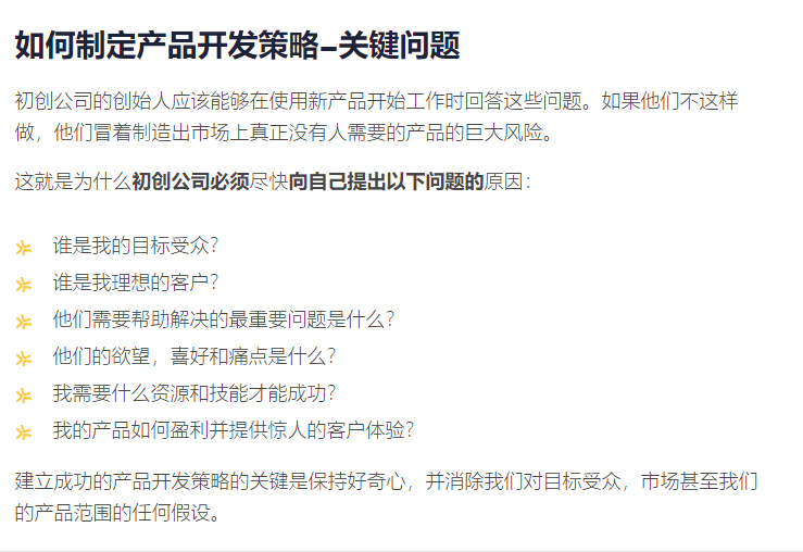 一旦您成功回答了產(chǎn)品開(kāi)發(fā)策略中的問(wèn)題,您就會(huì)發(fā)現(xiàn)更小,更具體的問(wèn)題會(huì)逐漸顯現(xiàn)出來(lái),并引導(dǎo)您成功地開(kāi)發(fā)產(chǎn)品。