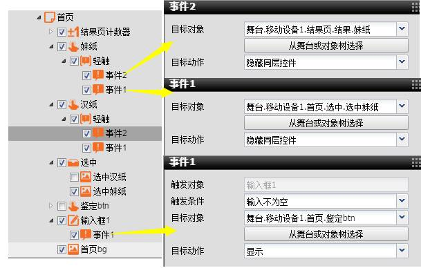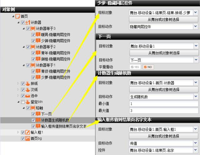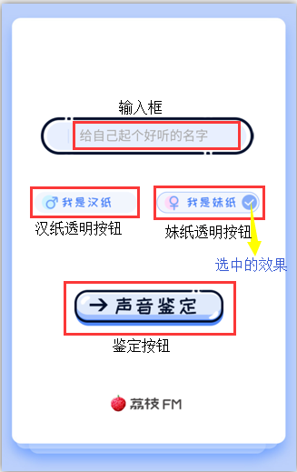 2、在將素材分別拖入對應的3個頁面中,在首頁輸入姓名的地方添加一個輸入框,設置輸入框透明背景為yes,將妹紙和漢紙的選中效果放在一個容器里,用兩個透明按鈕將妹紙和漢紙都覆蓋,在聲音鑒定位置添加一個透明按鈕;