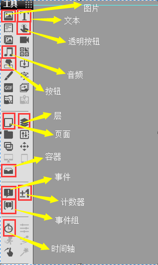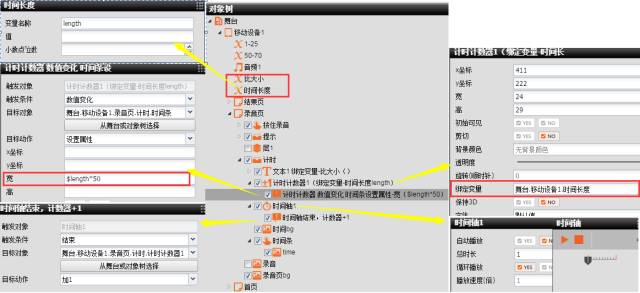 8、在第二頁中將時間條透明按鈕放入一個容器中,將這個容器命名為計時,這個容器里面都是實現(xiàn)計時功能的工具;在這個容器中添加一個1S的時間軸,再添加一個計數(shù)器,計數(shù)器綁定變量“時間長度”,設置計數(shù)器的最大值為5,最小值為0,給時間軸添加事件,時間軸結束,計數(shù)器加1;給計數(shù)器添加事件計數(shù)器數(shù)值變化,給“透明按鈕”時間條設置屬性,寬為$length*50,這樣就可以使時間條和計數(shù)器同步變化,注意時間條透明按鈕剪切屬性要打開;