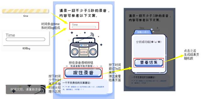 3、在錄音頁添加透明按鈕,將按住錄音按鈕覆蓋,將time條放在一個等大的透明按鈕中,用時間bg圖片覆蓋。將分析成功提示和時間太短提示放在一個容器下;