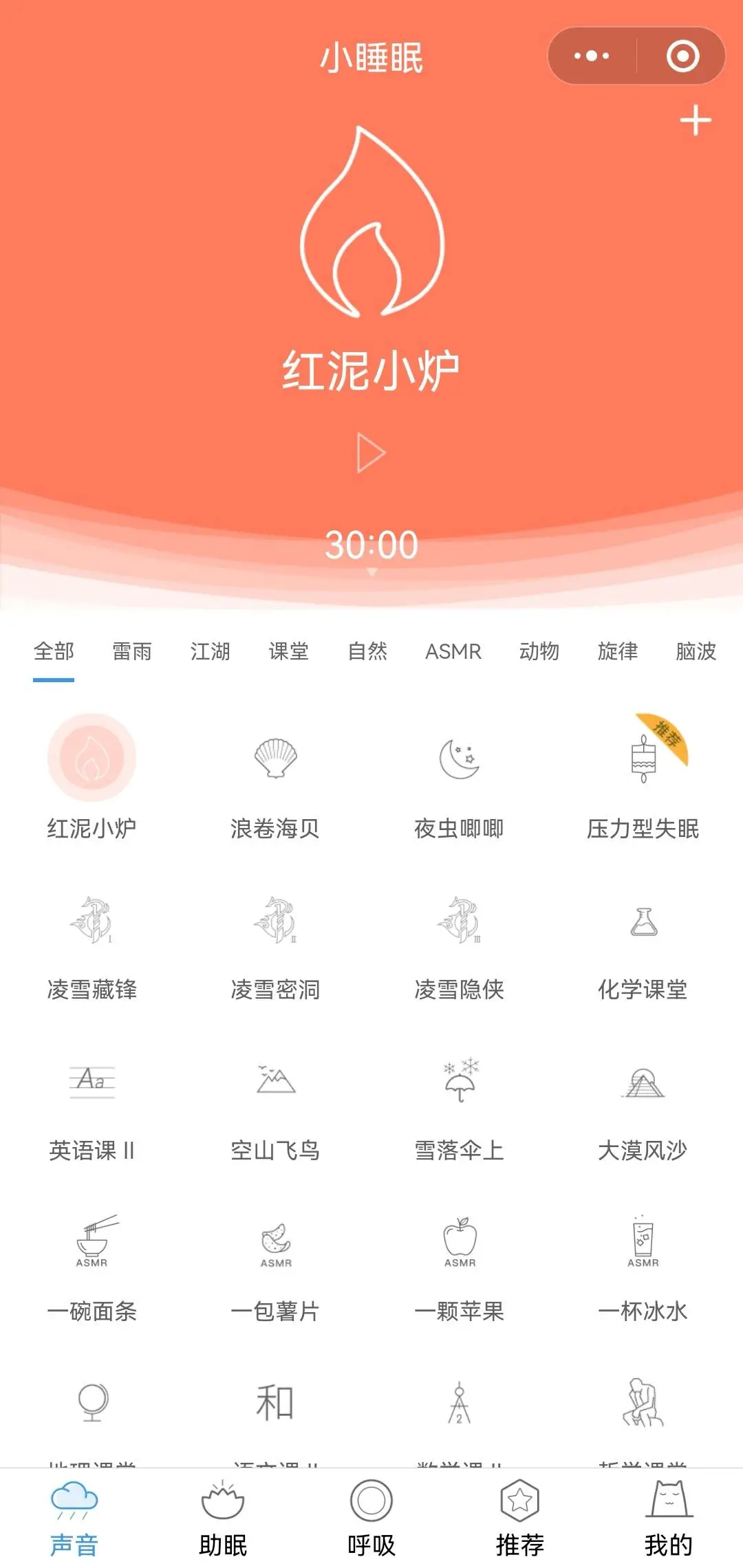 這款小程序里有很多的音樂供你選擇,而且這些背景音都很簡(jiǎn)單,就是不同類型的白噪音以及asmr等,不光可以用于助眠,還可以用于放松和專注。