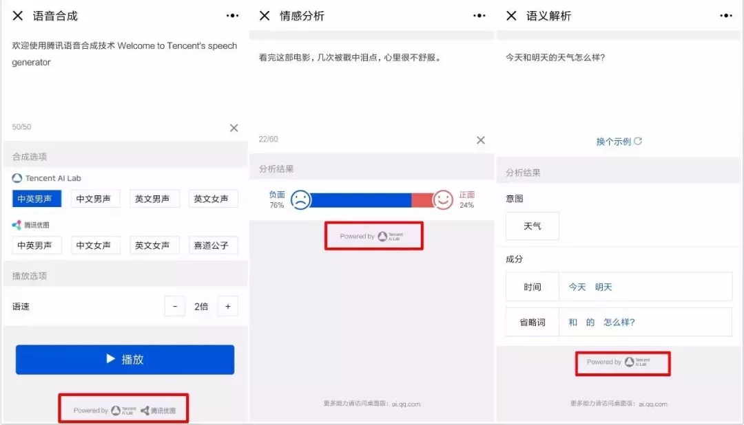 而騰訊的智能語(yǔ)音合成則致力于合成更加逼真的人聲,輸入一段文字進(jìn)去即可轉(zhuǎn)化成人聲,當(dāng)然還可以選多種風(fēng)格音色。