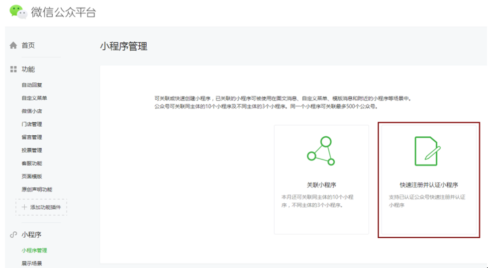 靠前步:進(jìn)入公眾號管理后臺首頁,選擇左邊菜單欄中的“小程序管理”,進(jìn)入頁面后點(diǎn)擊“快速注冊并認(rèn)證小程序”