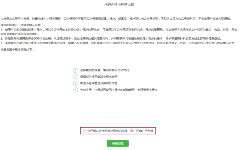 第二步:在快速創(chuàng)建小程序流程說明下,勾選,選擇“快速創(chuàng)建”