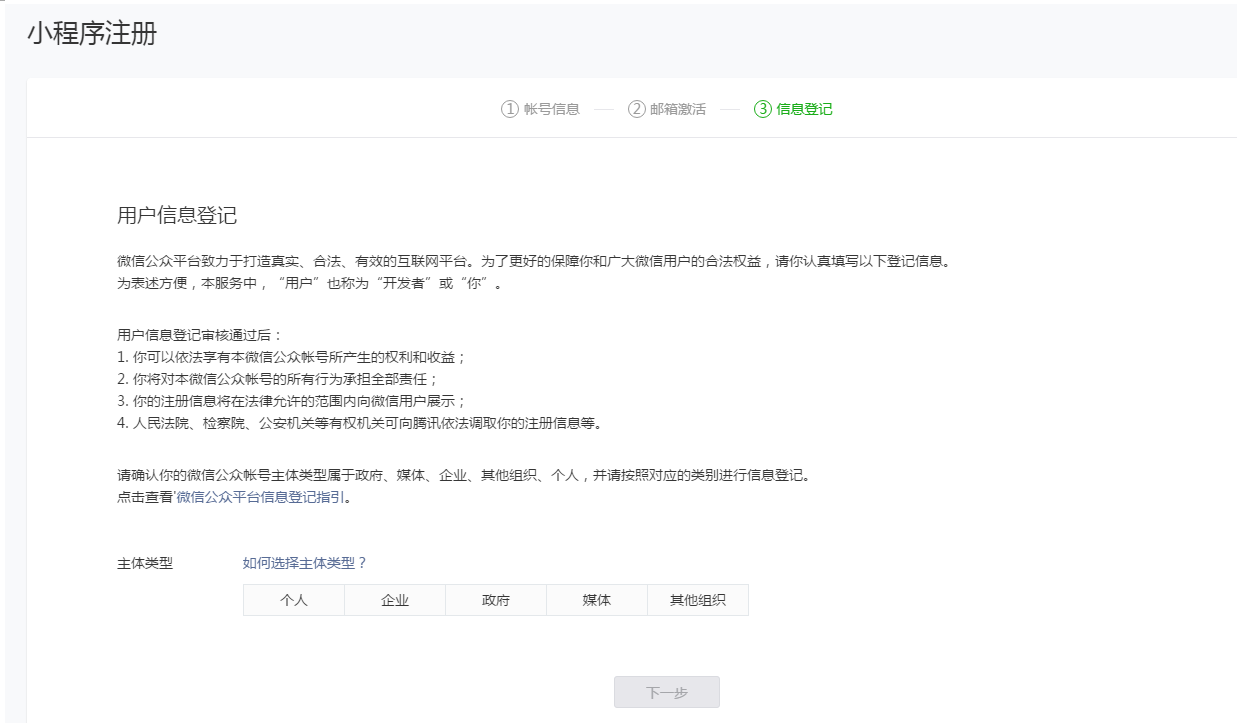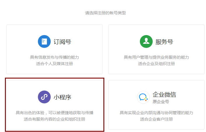 (2)還尚未注冊過公眾號的。建議先申請微信公眾平臺,然后申請認(rèn)證。非個體戶類型(企業(yè)、媒體、政府、其他組織類型)公眾號一個月可以復(fù)用資質(zhì)注冊5個小程序,個體戶一個月可以復(fù)用資質(zhì)注冊1個小程序。