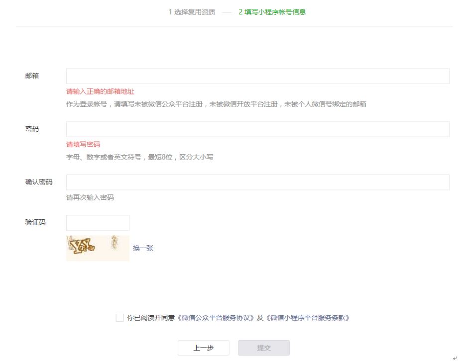 第五步:填寫小程序賬號信息。郵箱作為登錄賬號,必須填寫“未被微信公眾平臺注冊,未被微信開放平臺注冊,未被個人微信號綁定的郵箱”