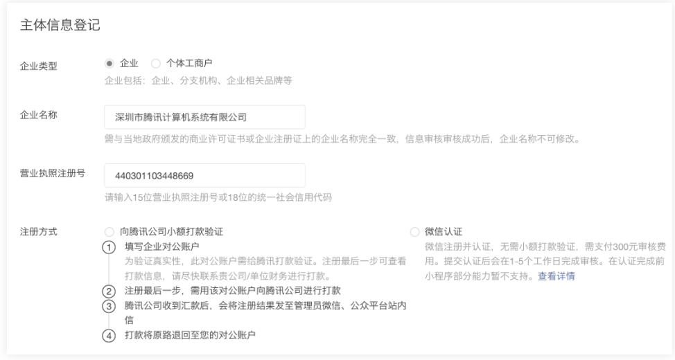 企業(yè)類型帳號可選擇兩種主體驗(yàn)證方式。 方式一:需要用公司的對公賬戶向騰訊公司打款來驗(yàn)證主體身份。打款信息在提交主體信息后可以查看到。 方式二:通過微信認(rèn)證驗(yàn)證主體身份,需支付300元認(rèn)證費(fèi)。認(rèn)證通過前,小程序部分功能暫無法使用。