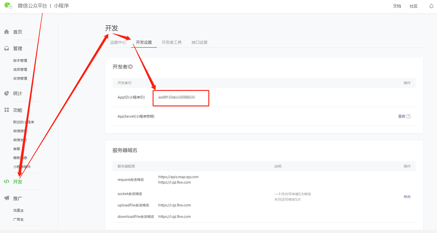 小程序的APPID可登錄【微信小程序-開發(fā)-開發(fā)設(shè)置-開發(fā)者ID】下獲取。