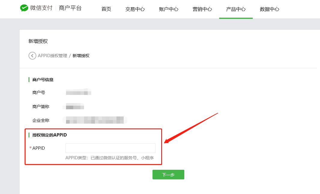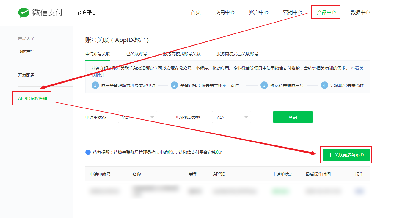 1、登錄微信商戶平臺(tái),進(jìn)入【產(chǎn)品中心-APPID授權(quán)管理】,點(diǎn)擊“關(guān)聯(lián)更多APPID”,輸入小程序的APPID進(jìn)行授權(quán)綁定。