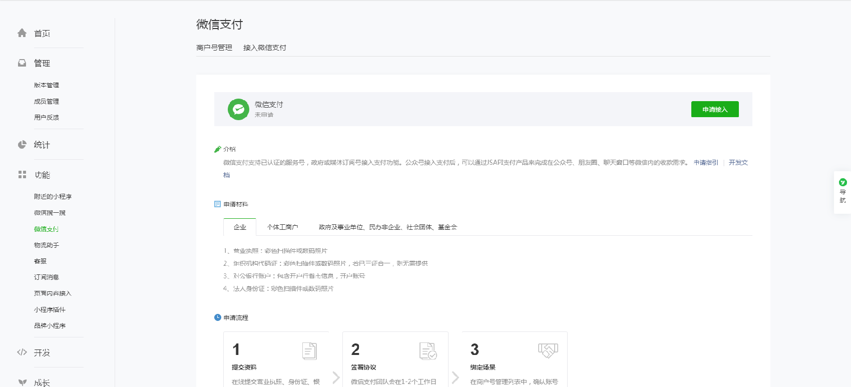 首先需要登錄微信小程序的后臺,再點(diǎn)擊進(jìn)入【微信支付-接入微信支付】,然后選擇“申請接入”。