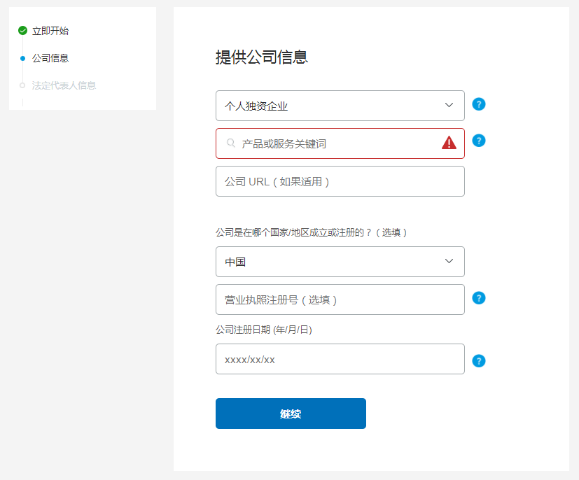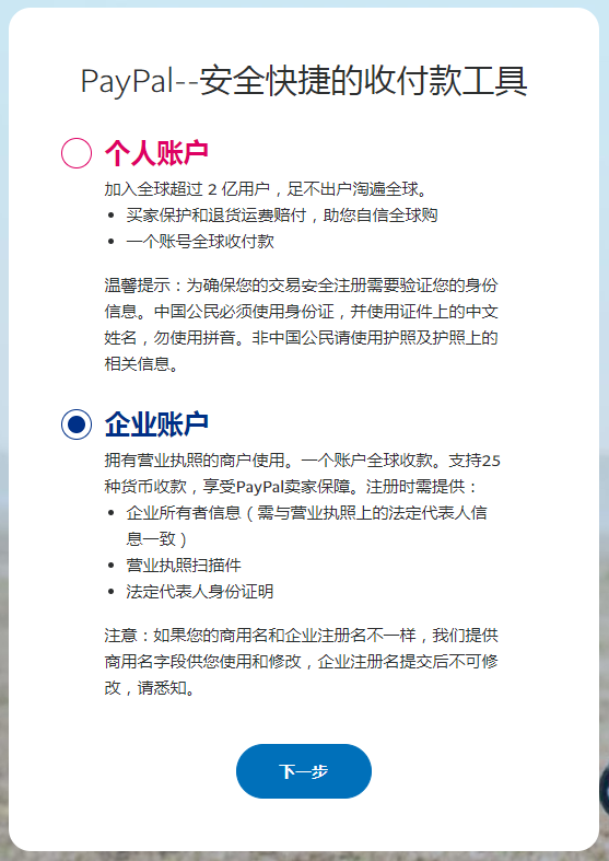 1.2 根據(jù)實(shí)際情況,選擇合適的賬戶類型。有營業(yè)執(zhí)照可以選“企業(yè)賬戶”,沒有營業(yè)執(zhí)照可以選“個(gè)人賬戶”。