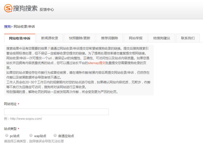 收錄地址:http://fankui.help.sogou.com/index.php/web/web/index?type=1