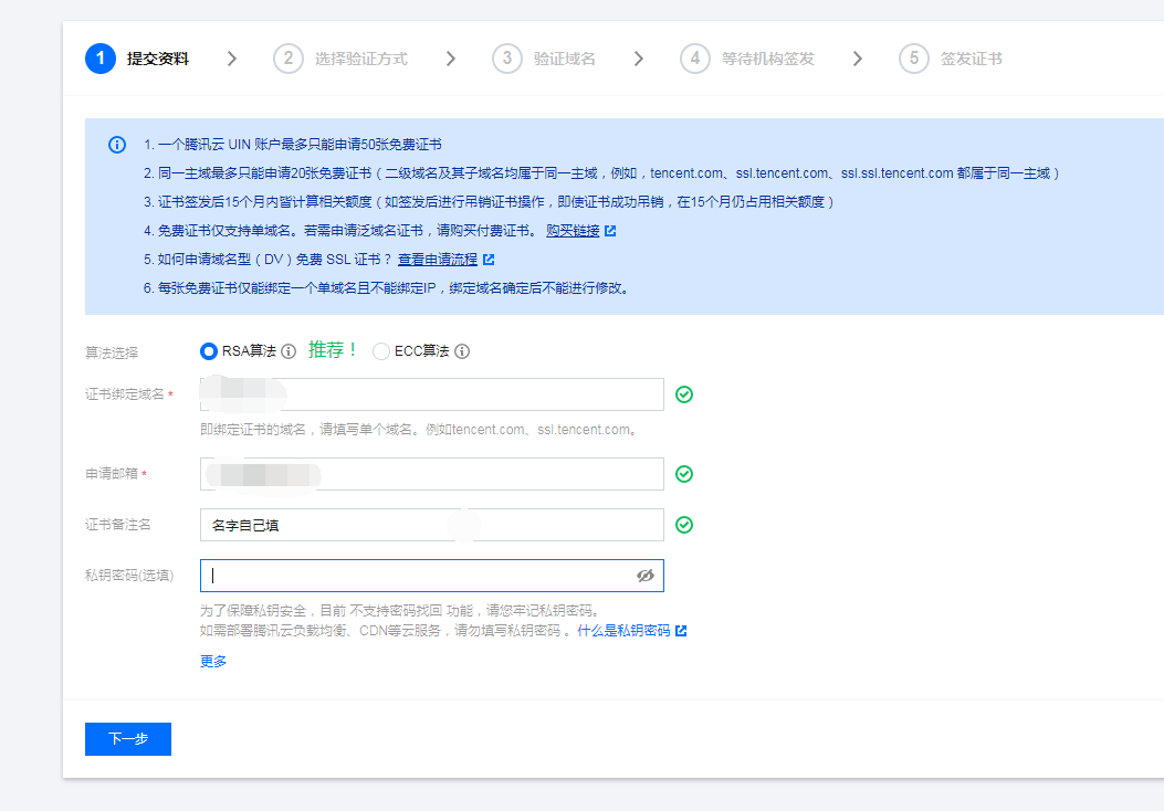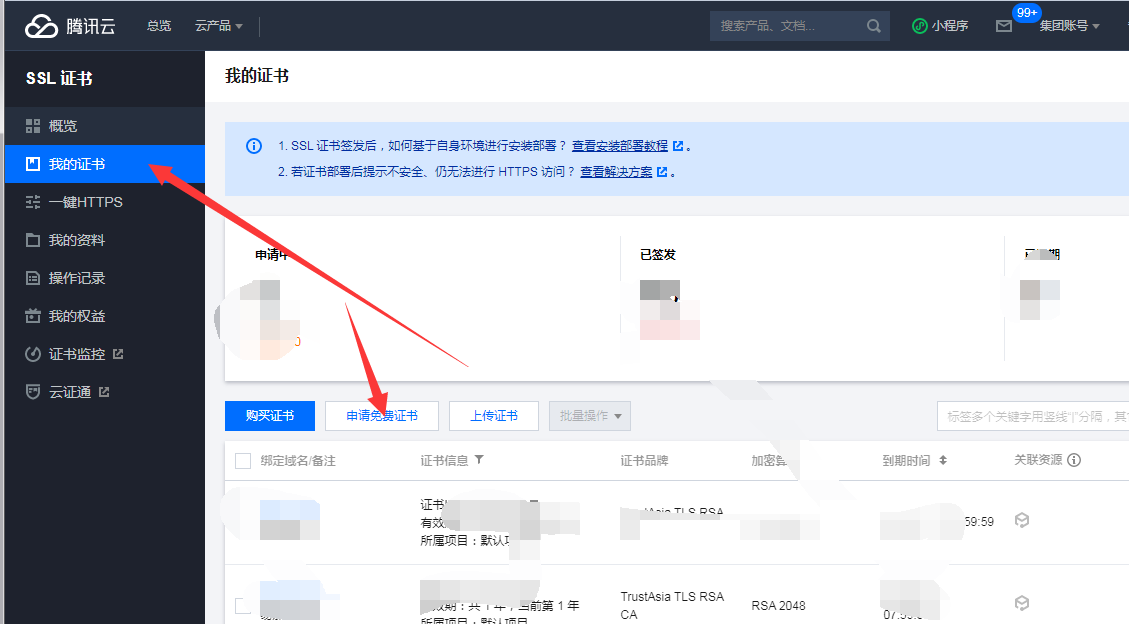 4. 選擇? “我的證書”---“申請免費證書”