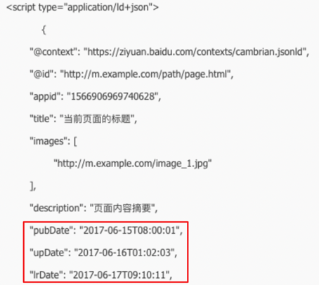 使用 JSON-LD格式在頁面中嵌入代碼即可,詳細標準及提交格式可以參考《百度搜索落地頁時間因子規(guī)范》。