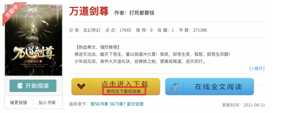 ?頁面在下載前提示用戶需優(yōu)先下載小說閱讀器?