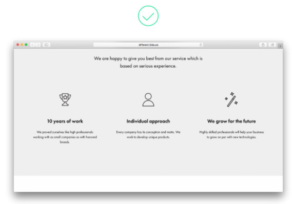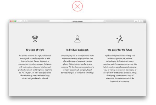 當(dāng)在狹窄的列中存在大量文本副本時(shí),很難閱讀,因?yàn)榫W(wǎng)站訪問者必須從一行跳到下一行。而且,就是不好看!最好減少列數(shù)并縮短文本副本。否則,沒有人會(huì)讀它。