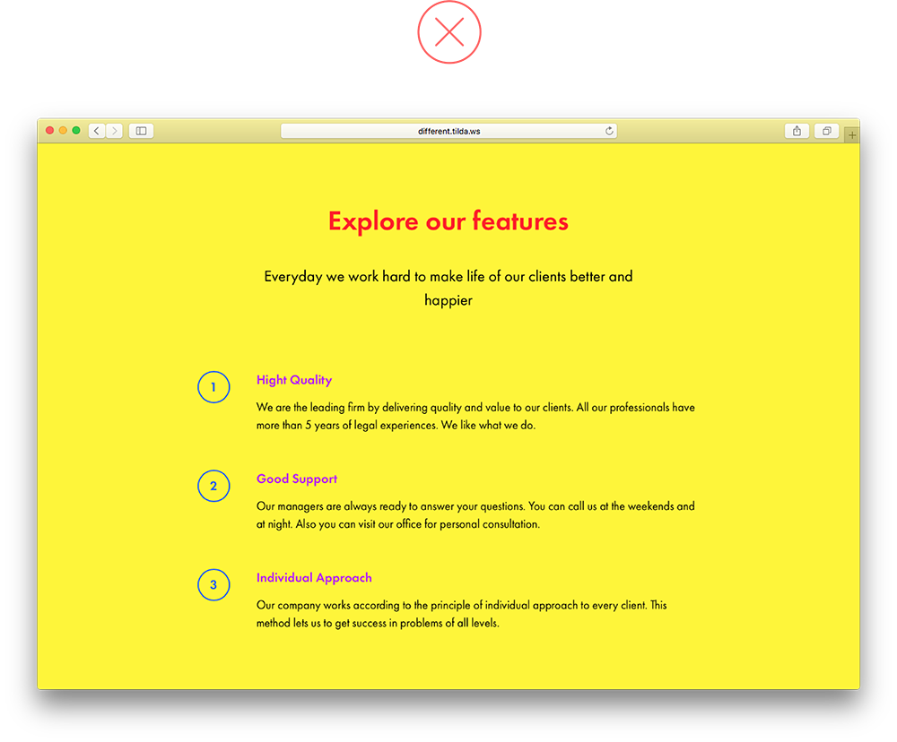 在頁面上使用太多顏色會令人困惑。此外,尚不清楚哪些位更重要。一兩種顏色就足以賦予真正重要的東西以視覺重量。