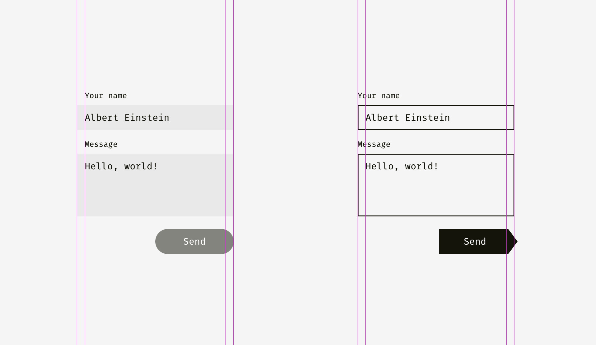 在左側(cè)的圖片中,輸入字段具有淺色背景。它可以稍微“爬出”超出字段名稱和用戶輸入的文本對(duì)齊的線。至于按鈕,它是圓形的,也就是說(shuō),理論上應(yīng)該將它移動(dòng)到背景邊緣之外一點(diǎn),以便在視覺(jué)上平衡它。但是,正如您所看到的,按鈕是黑色的,這給了它額外的重量 - 這意味著在這種情況下,您可以簡(jiǎn)單地將它與矩形背景對(duì)齊。 在右側(cè),輸入字段具有清晰的邊框。我將字段名稱與這些邊框?qū)R,已經(jīng)輸入的文本會(huì)稍微縮進(jìn)?!鞍l(fā)送”按鈕有一個(gè)三角形面,這意味著該按鈕需要稍微向右移動(dòng)以與輸入字段的矩形框保持平衡。