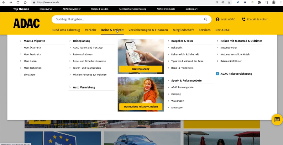 一些實(shí)現(xiàn)添加了淡入/淡出過渡以使巨型下拉菜單的出現(xiàn)不那么突然,但實(shí)際上它導(dǎo)致進(jìn)入/退出延遲增加到 0.8-0.9 秒,這也引入了更明顯的落后。ADAC.de就是一個(gè)例子,它具有 100 毫秒的淡入延遲和 300 毫秒的淡出過渡。(不過,在大型下拉菜單的不同類別之間切換時(shí),這種轉(zhuǎn)換并不適用。) 顯然,覆蓋層保持可見的時(shí)間越長(zhǎng),我們對(duì)有意逃離覆蓋層的人的懲罰就越嚴(yán)厲。實(shí)際上,這會(huì)成為一個(gè)問題,因?yàn)槲覀冊(cè)谟脩舨僮骱?UI 響應(yīng)之間引入了一個(gè)表面上的超時(shí)。