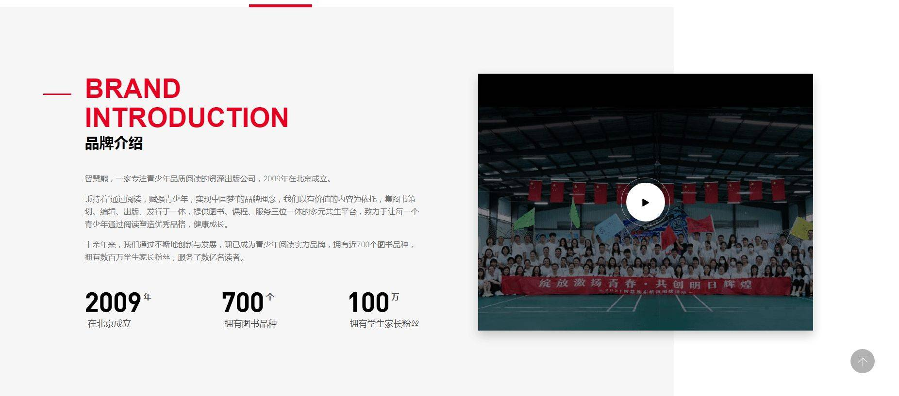 品牌介紹左側展示了智慧熊的品牌介紹,成立時間,圖書品種,家長粉絲等醒目的數(shù)字,加上右側的宣傳視頻,使得智慧熊品牌價值形成廣泛傳播的共識。