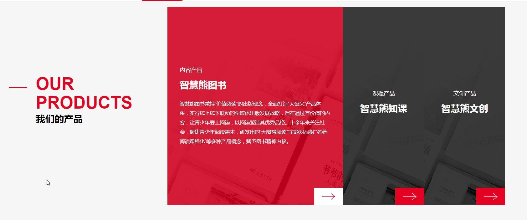 關于產(chǎn)品的展示,沒有做以往的列表展示,而是在左側三分之一部分用來放標題,通過做邊窄,右邊寬的形式,讓用戶的第一眼,落在智慧熊圖書上。