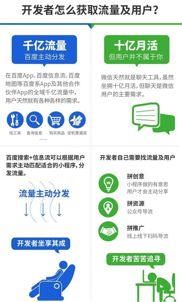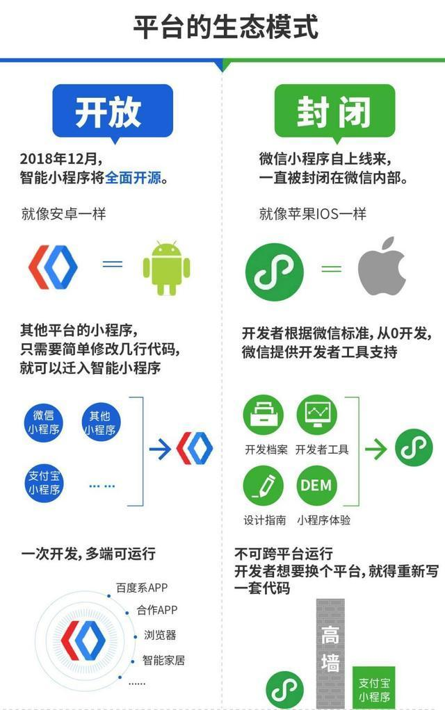 蘋果封閉,微信封閉。安卓開放,百度開放;蘋果一個系統(tǒng)一家使用,微信小程序僅僅微信一家可用,安卓一個系統(tǒng)大家使用或者改改再用。百度智能小程序應(yīng)用于百度系所有產(chǎn)品,年底開源后其它支持小程序的軟件也能用;蘋果實力強勁安卓單一廠商難以戰(zhàn)勝,微信用戶活躍率強勁單一廠商無法戰(zhàn)勝。安卓抱團全暖,多個廠商撐起一片天,百度智能小程序全家出動,甚至和其它廠商有合作,共同使用百度智能小程序;蘋果規(guī)則我定,隨時讓你下架,微信規(guī)則我定,也可以讓你下架,安卓自由度高,可以自由發(fā)布,百度暫時未知。