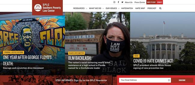 另一個美國非營利組織Southern Poverty Law Center的主頁設(shè)計類似于新聞出版物,圖像塊與故事和更新相對應(yīng)。它還優(yōu)先考慮鼓勵訪問者訂閱其時事通訊的 CTA。