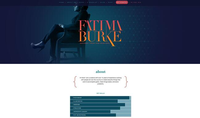 例如,前端開發(fā)人員和設(shè)計(jì)師 Fatima Burke的個(gè)人網(wǎng)站體現(xiàn)了對(duì)個(gè)人網(wǎng)站、列表技能、客戶、項(xiàng)目和產(chǎn)品的更專業(yè)的理解。