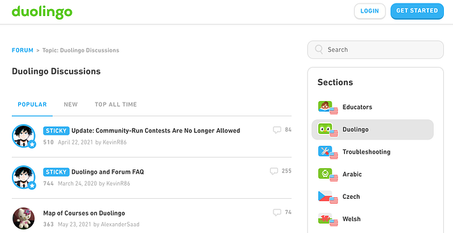 例如,教育網(wǎng)站可能包含一個(gè)論壇,學(xué)生可以在其中討論課程并回答彼此的問題。語言學(xué)習(xí)應(yīng)用程序Duolingo 就是這樣做的,它為每種語言以及其他主題(如教育者、故障排除和一般性討論)提供了一個(gè)部分。