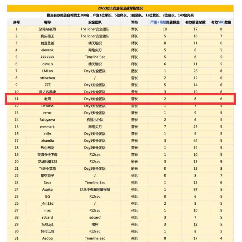 提交近2000個(gè)有效報(bào)告 產(chǎn)生1位軍長(zhǎng)、5位師長(zhǎng)、1位團(tuán)長(zhǎng) 12位營(yíng)長(zhǎng)、2位班長(zhǎng)、149位列兵 恭喜所有獲得軍銜的白帽戰(zhàn)士們?