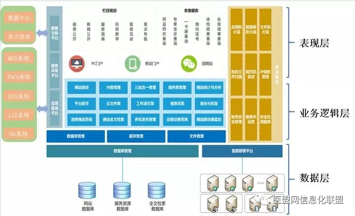 表現(xiàn)層:網(wǎng)站瀏覽者可通過前端網(wǎng)站頁面進(jìn)行頁面的瀏覽,獲取醫(yī)院相關(guān)新聞資訊,對醫(yī)院整體情況加以了解。醫(yī)院患者能夠通過門戶網(wǎng)站實(shí)現(xiàn)網(wǎng)上預(yù)約掛號,進(jìn)行問題咨詢與在線交流。員工登錄后能后實(shí)現(xiàn)在線會議報(bào)名,精品課程學(xué)習(xí)等操作。網(wǎng)站群整體對外宣傳展現(xiàn),構(gòu)成系統(tǒng)表現(xiàn)層。