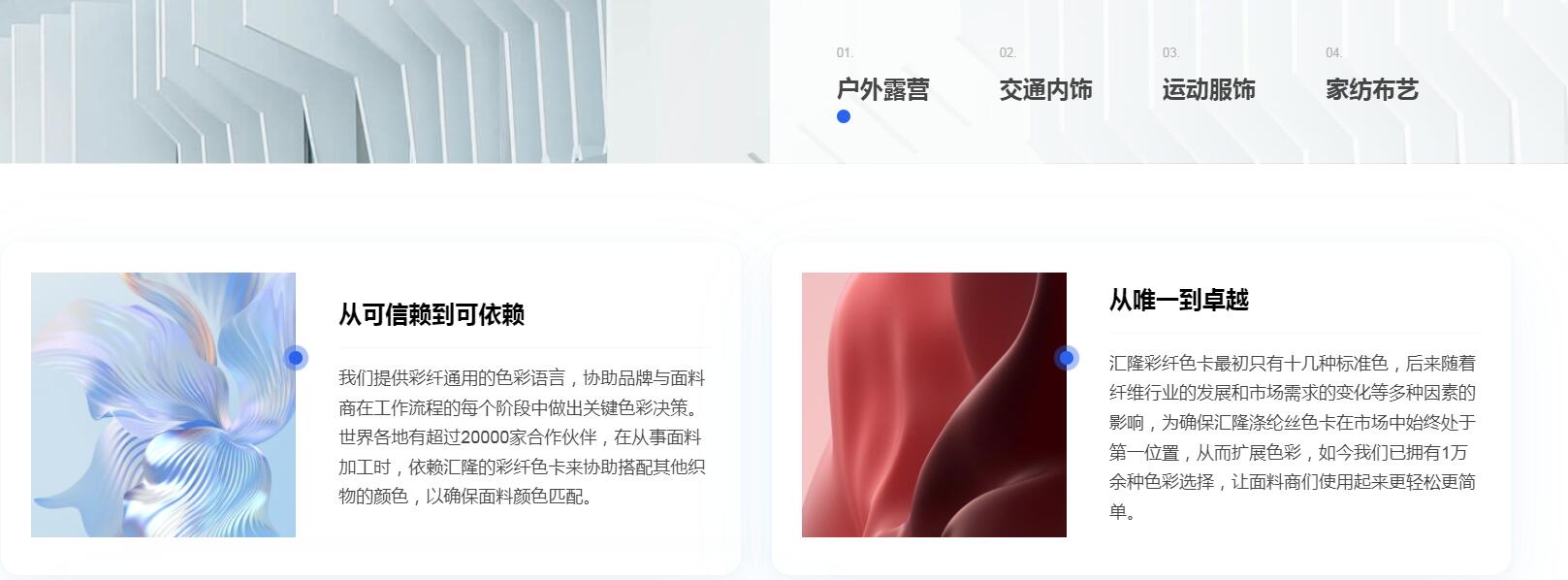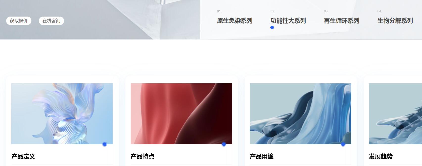 ??在紡織材料公司網站上,展示產品的應用場景可以幫助潛在客戶更好地理解產品的用途和價值。將不同行業(yè)的應用場景列為主要的類別,例如戶外露營、交通內飾、運動服飾、家紡布藝等。在網站導航或首頁上提供這些類別的鏈接,讓用戶快速找到感興趣的行業(yè)應用。
